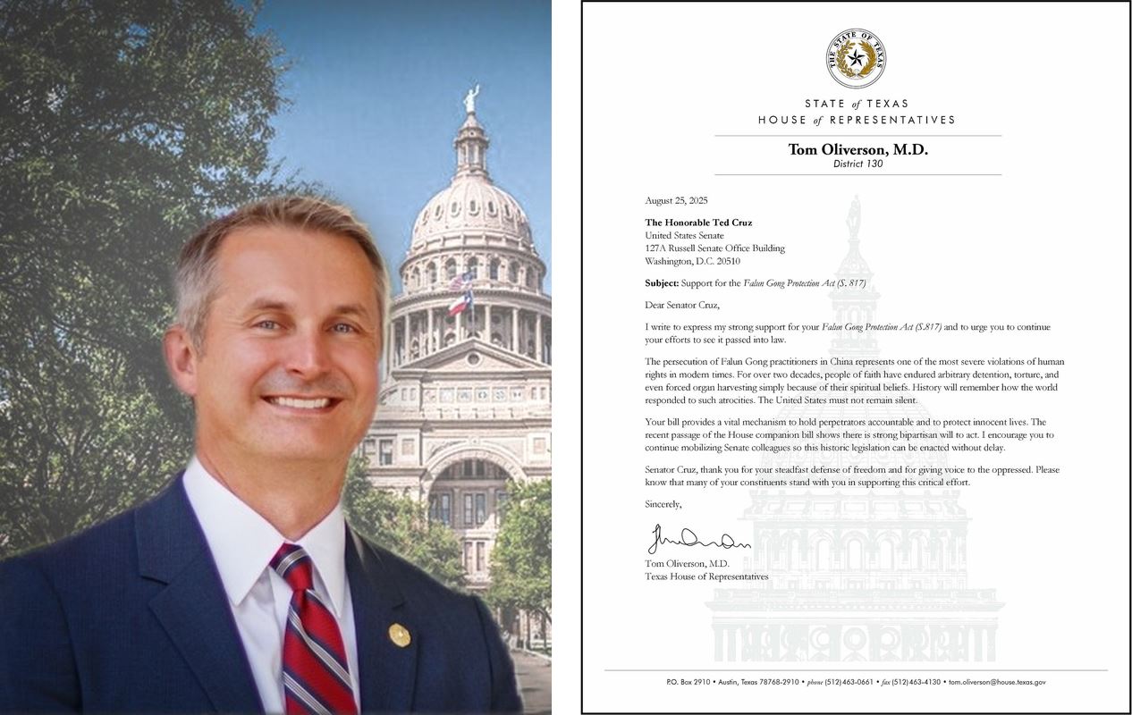 德州众议院多数党领袖、第十五选区资深众议员汤姆·奥利弗森(Tom Oliverson)医师在信中说:“二十多年来,这些有信仰的人们仅仅因为他们的精神信仰就被肆意拘留,酷刑折磨,甚至活摘器官。历史会铭记这个世界对这些暴行做出了怎样的回应,美国千万不能保持沉默。”