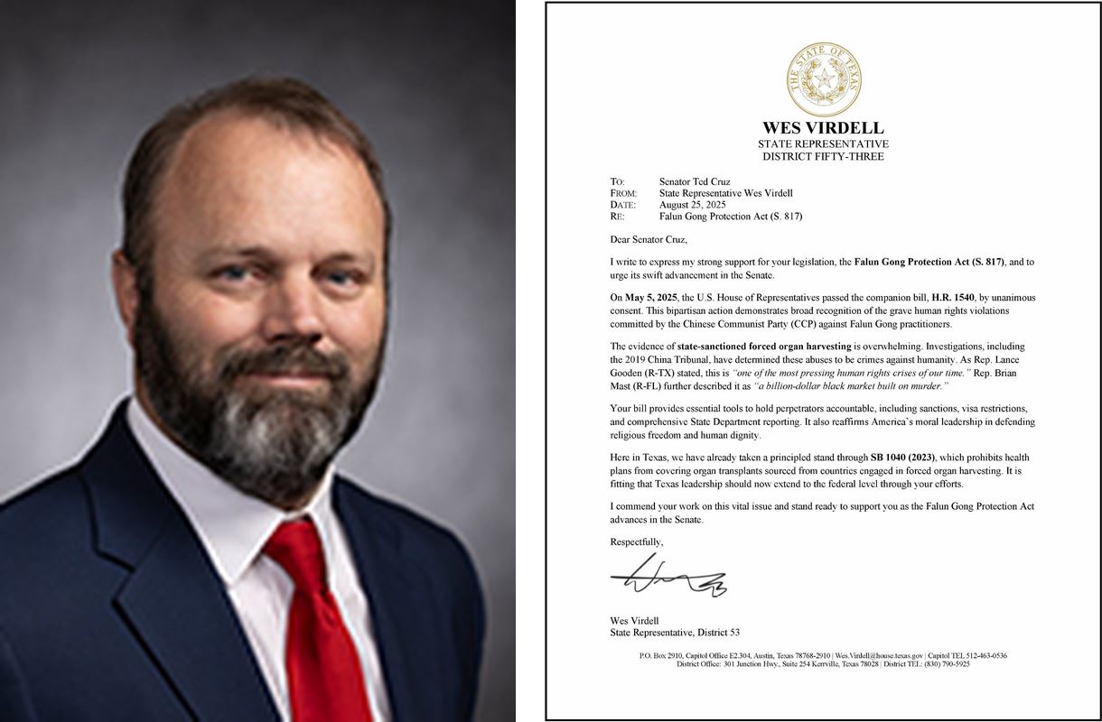 德州众议院第五十三选区众议员韦斯·维尔德尔(Wes Virdell)致信克鲁兹参议员,表达对《法轮功保护法案》的强烈支持,并敦促该法案在参议院迅速推进。