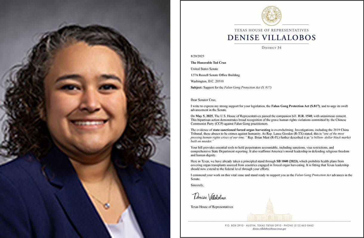 德州第三十四选区众议员丹妮丝·维拉洛博斯(Denise Villalobos)致信感谢克鲁兹参议员在这一关键议题上的努力。她说:“随着《法轮功保护法案》在美国参议院推进,我随时准备给予支持。”