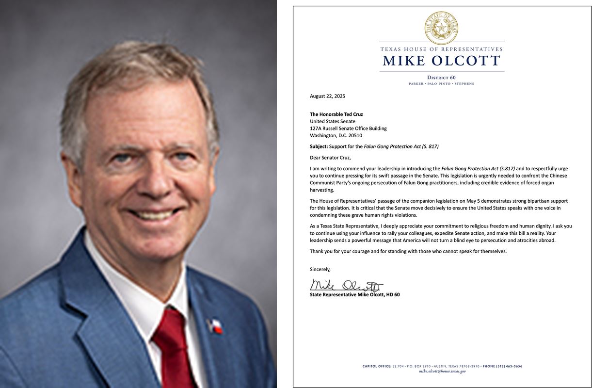 德州第六十选区州众议员麦克·奥尔科特(Mike Olcott)在信中说:“此立法刻不容缓,旨在应对中共持续迫害法轮功修炼者的行径,包括活摘器官的可信证据。”