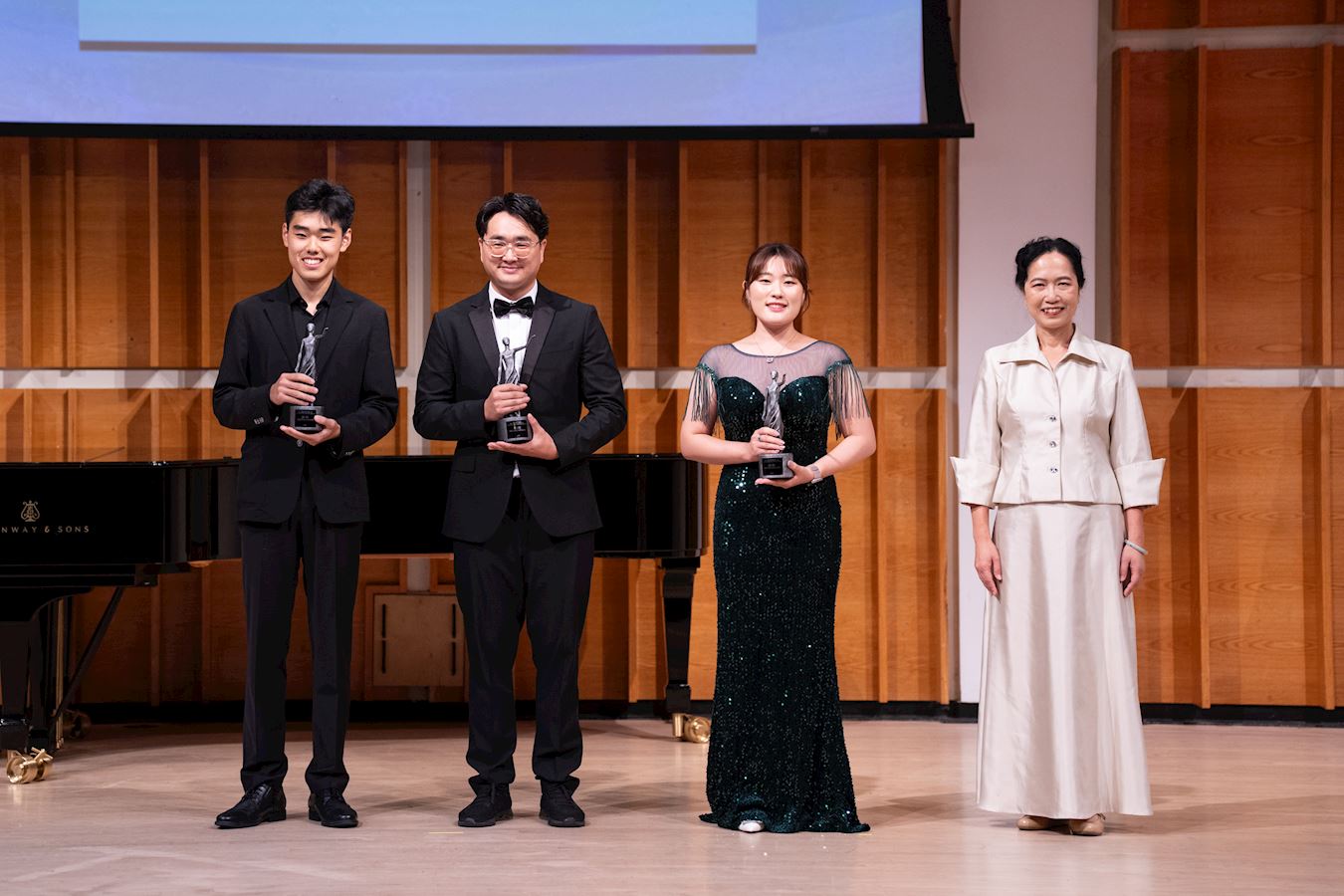 ![]() 图4:第十届新唐人“全世界华人美声唱法声乐大赛”决赛后颁奖典礼。图为银奖获得者Jiyun Bae(左三)、郑绍丰、Shaofeng Zheng(左二)、Kevin Zhang(左一)。 |