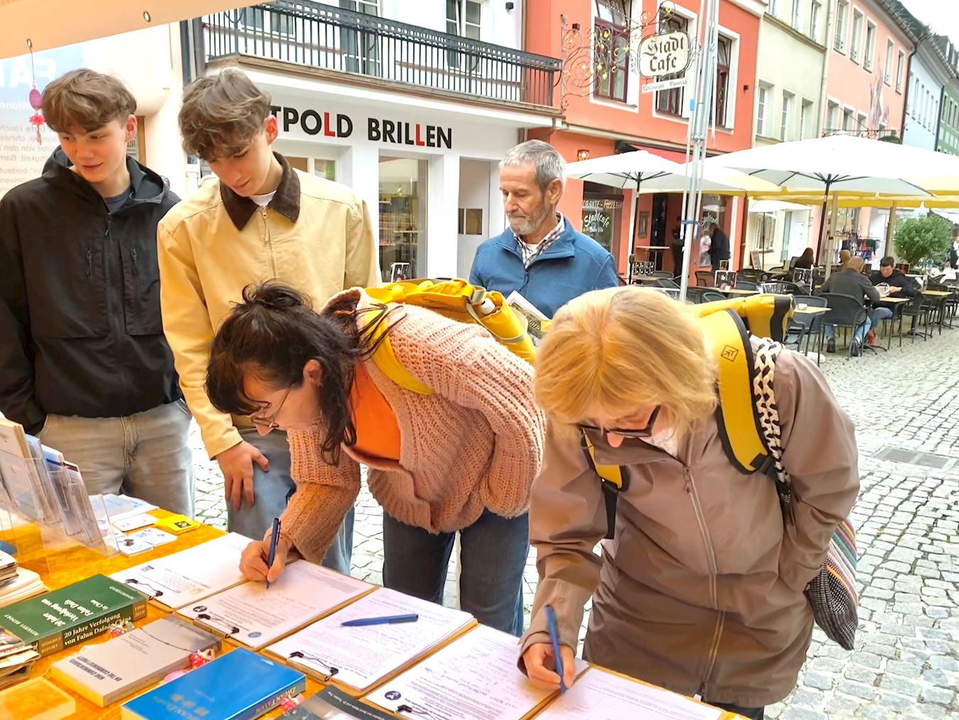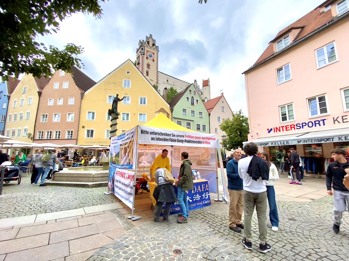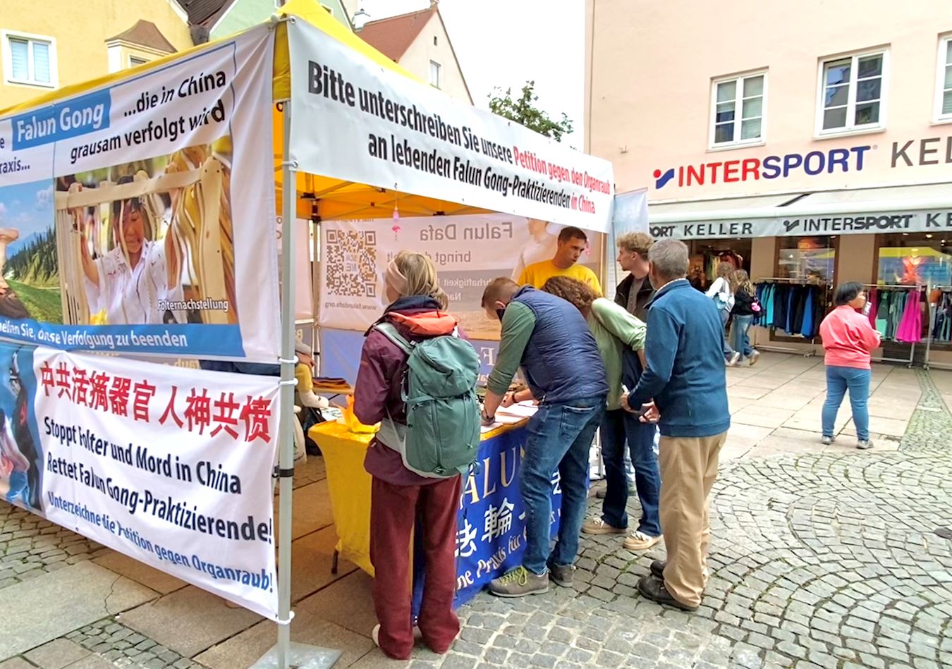 法轮功学员的展位设置在市中心城市喷泉(Stadtbrunnen),学员展示功法,挂出横幅,向路人讲述法轮功真、善、忍理念,揭露中共迫害法轮功的真相,很多人停下脚步与学员交谈。当他们了解了法轮功学员反迫害的真相之后,纷纷签名制止中共迫害。