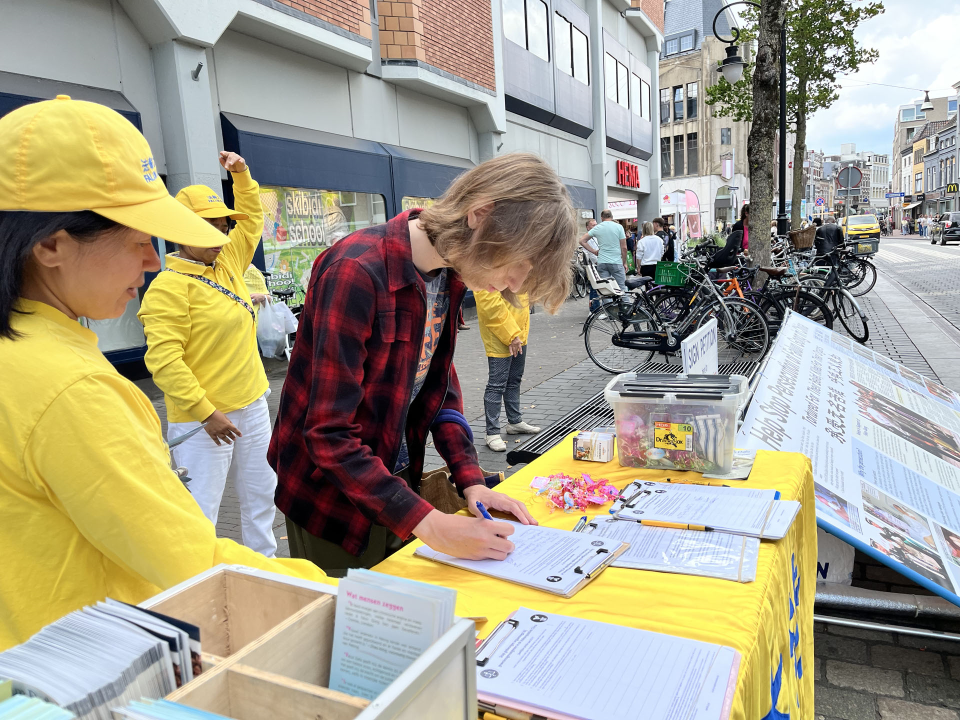 星期六午后,学员们在多德雷赫特市商业中心布置真相展板,展示法轮功功法,发放传单,征集反迫害签名,吸引络绎不绝的行人驻足了解。善良的多德雷赫特居民听闻法轮功修炼者在中共统治下的中国无法自由修炼,至今仍在遭受残酷迫害时,纷纷在向G7+7国家提交的请愿书上签名表达支持,甚至在征签桌前排起了队(注:G7国家为美国、加拿大、法国、德国、意大利、日本、英国,+7国家为阿根廷、澳大利亚、印度、以色列、墨西哥、韩国及台湾)。
