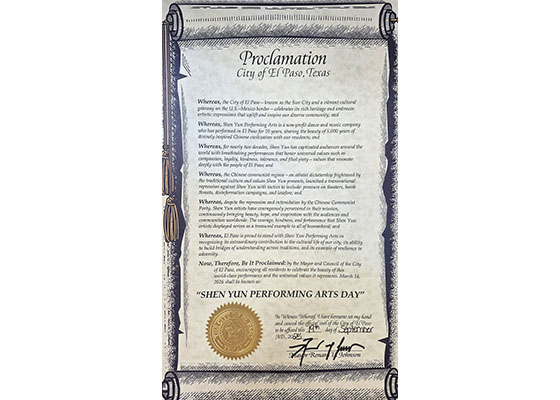 九月十九日,德克萨斯州西部城市艾尔帕索市市长及市议会颁发褒奖,宣布二零二六年三月十四日为“神韵艺术日”。他们盛赞神韵艺术团让当地民众欣赏到高超的艺术和传统价值。
