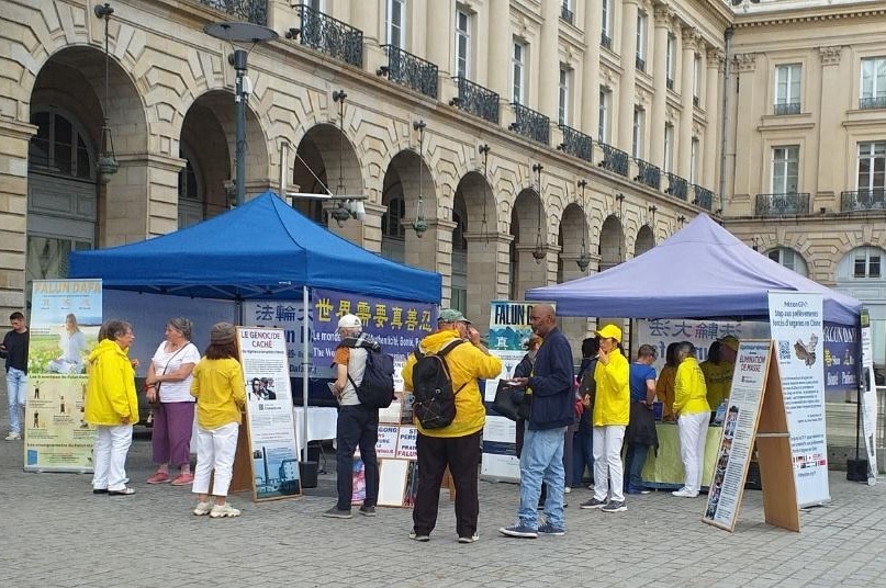【明慧网二零二五年九月二十三日】法国西部地区的部分法轮功学员于九月二十日星期六,在布列塔尼大区首府雷恩(Rennes)市共和国广场举行了弘法和讲真相的活动。他们向民众介绍法轮功及其修炼准则真、善、忍,演示功法,并揭露中共对法轮功学员的迫害以及延续到海外的跨国镇压。