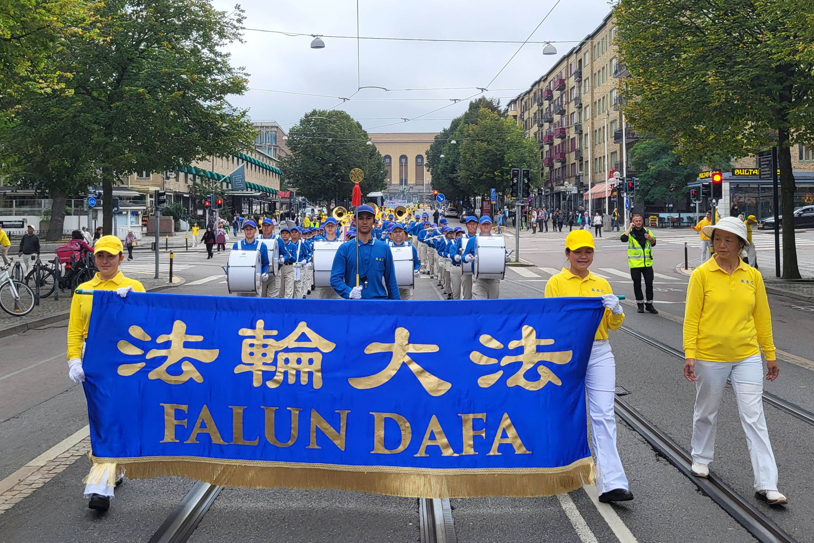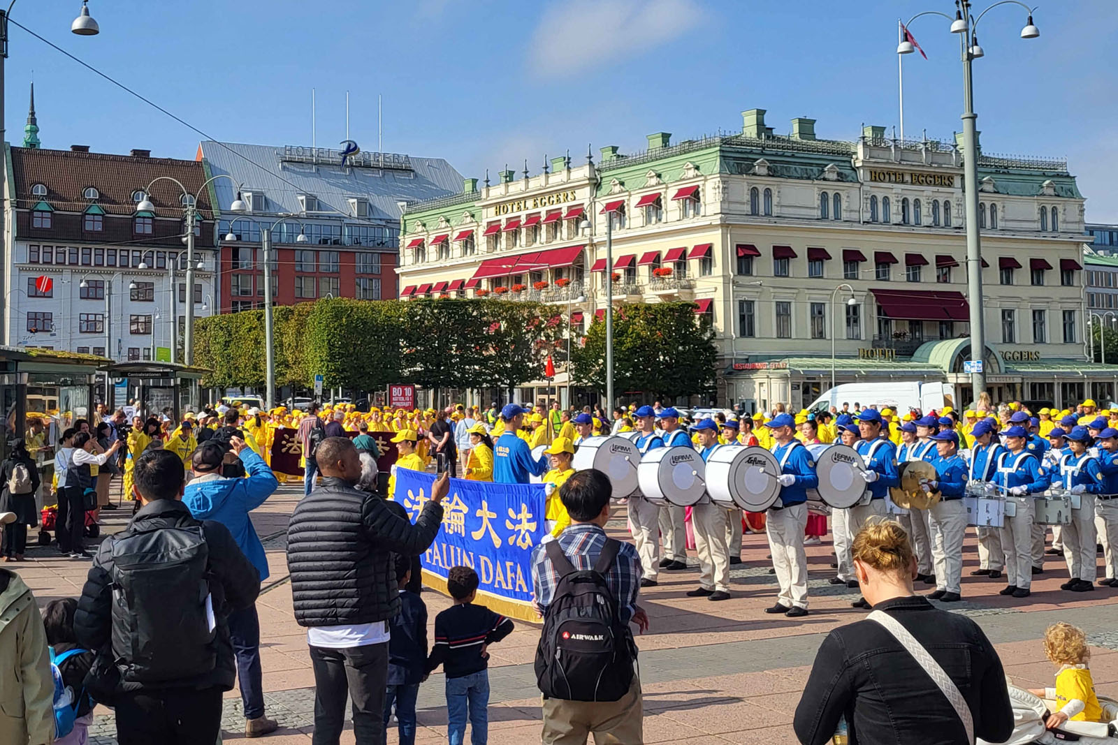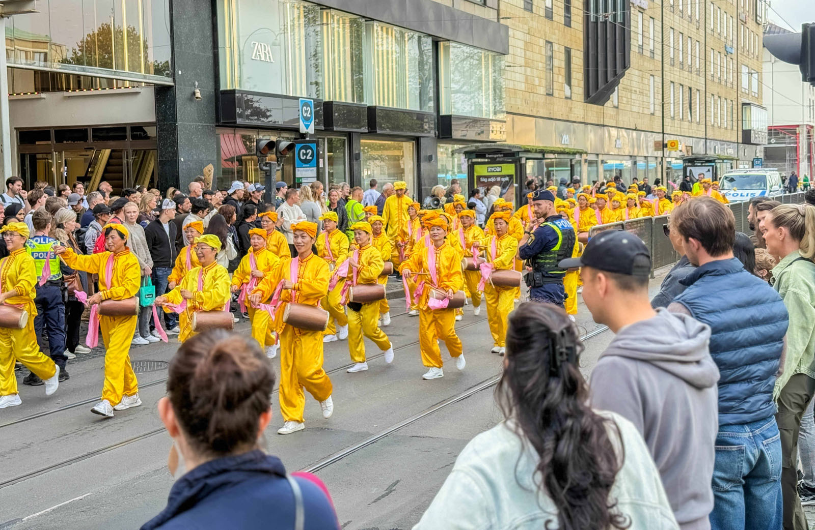在著名的国王门大道(Kungsportsavenyen)上,众多路人停下脚步,看着眼前这支独特的队伍,感受着各族裔法轮功学员带来的祥和,很多人拿出手机拍摄留念。首先映入眼帘的是天蓝色的天国乐团,乐曲雄壮威武、气势恢宏;随后是醒目的三个大字——真善忍;紧接着的金色方阵里,法轮功学员们演示着舒缓的功法动作,看着各色横幅,人们了解到法轮大法不仅在北欧,还弘传世界逾百个国家。祥和的游行队伍、美好的信息,令市民和游客心生敬意和感佩,也被法轮功吸引希望了解更多详情。