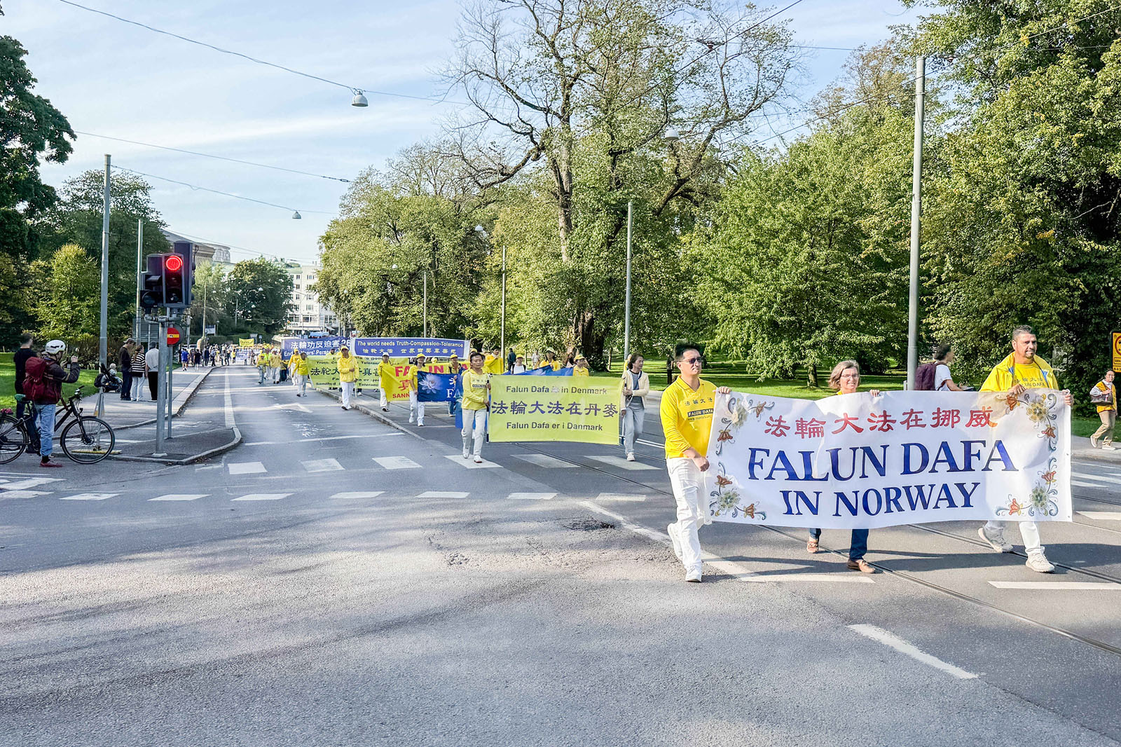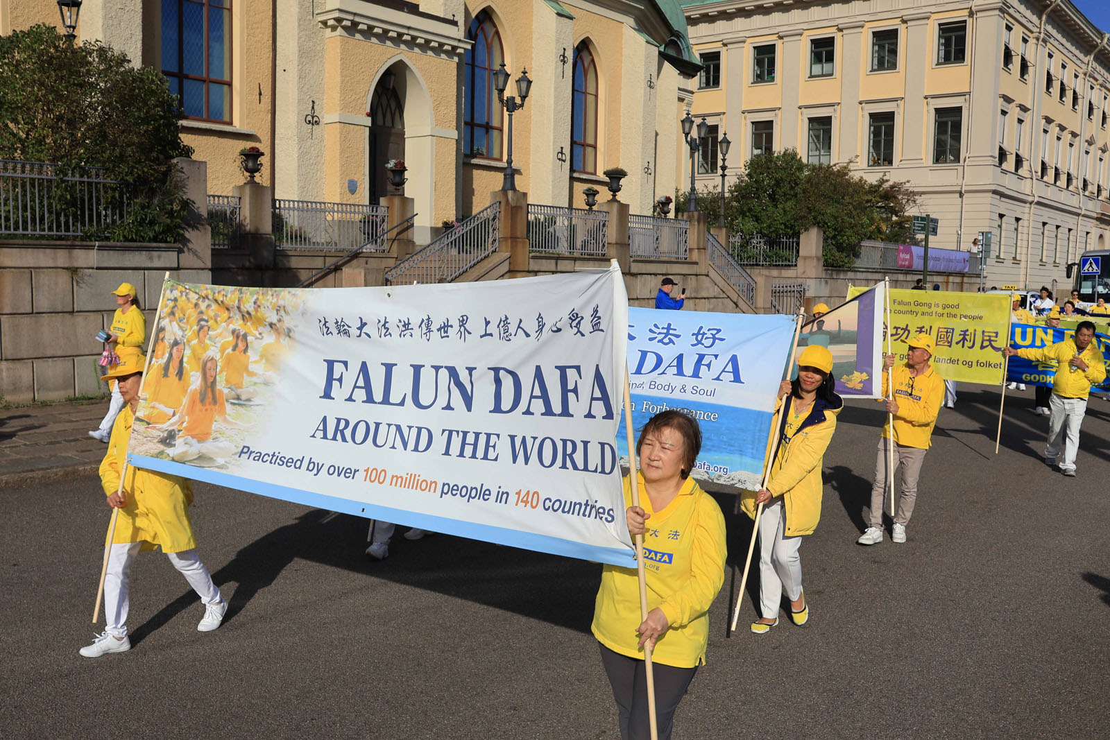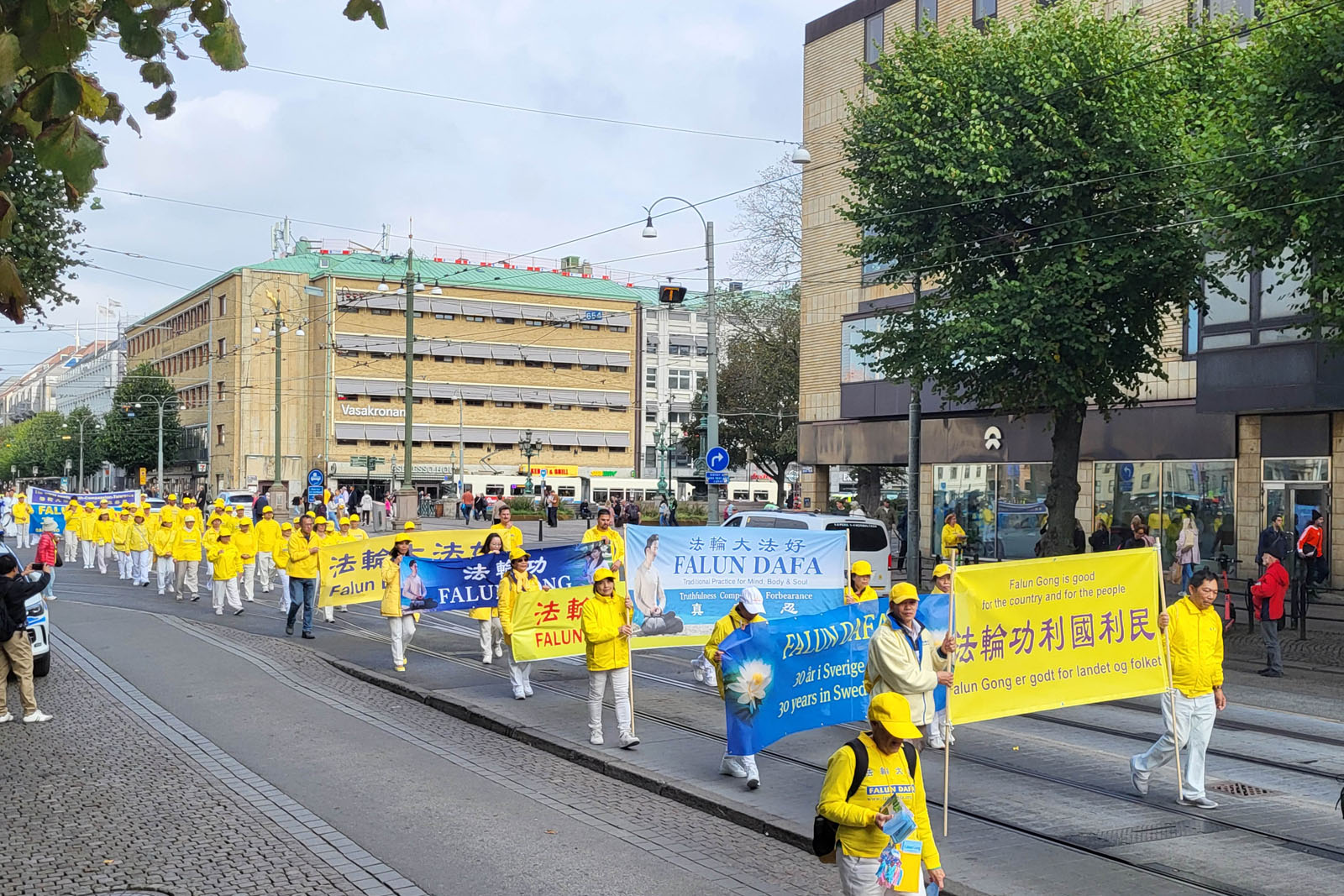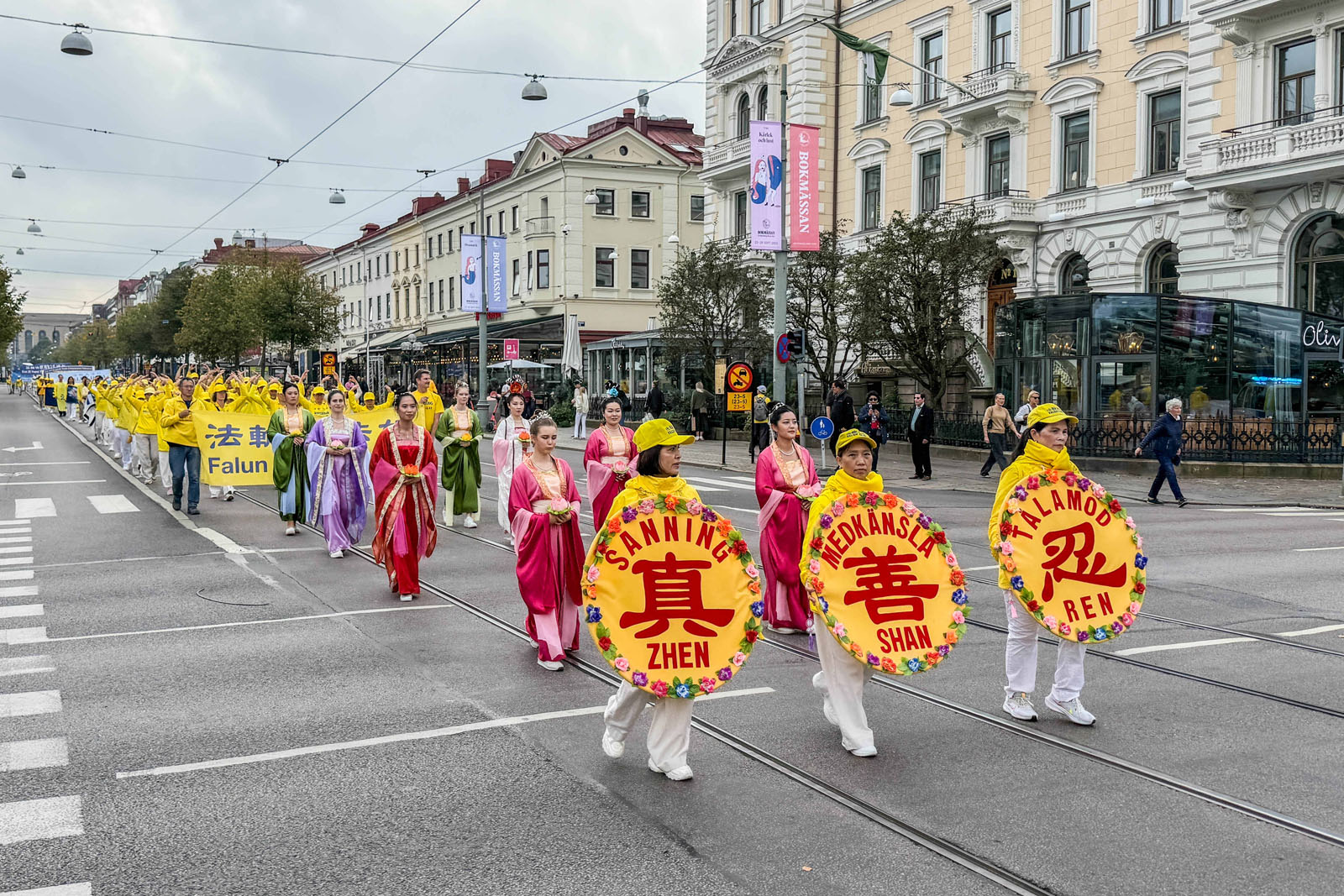 在著名的国王门大道(Kungsportsavenyen)上,众多路人停下脚步,看着眼前这支独特的队伍,感受着各族裔法轮功学员带来的祥和,很多人拿出手机拍摄留念。首先映入眼帘的是天蓝色的天国乐团,乐曲雄壮威武、气势恢宏;随后是醒目的三个大字——真善忍;紧接着的金色方阵里,法轮功学员们演示着舒缓的功法动作,看着各色横幅,人们了解到法轮大法不仅在北欧,还弘传世界逾百个国家。祥和的游行队伍、美好的信息,令市民和游客心生敬意和感佩,也被法轮功吸引希望了解更多详情。