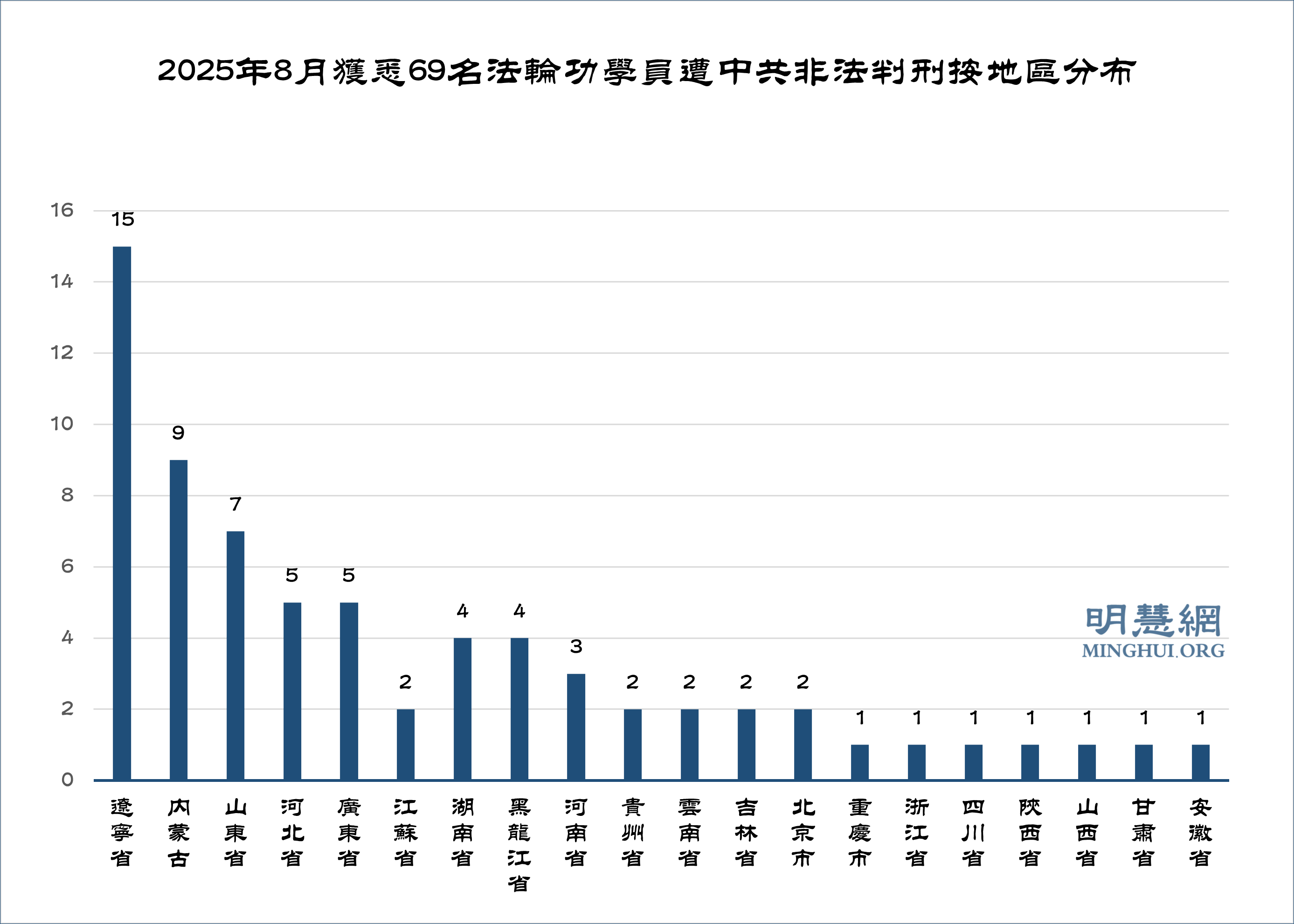 据明慧网报道统计,获知八月份获知有69名法轮功学员被非法判刑。其中,辽宁省15人,内蒙古9人,山东省7人,河北省、广东省各5人,湖南省、黑龙江省各4人,河南省各3人。