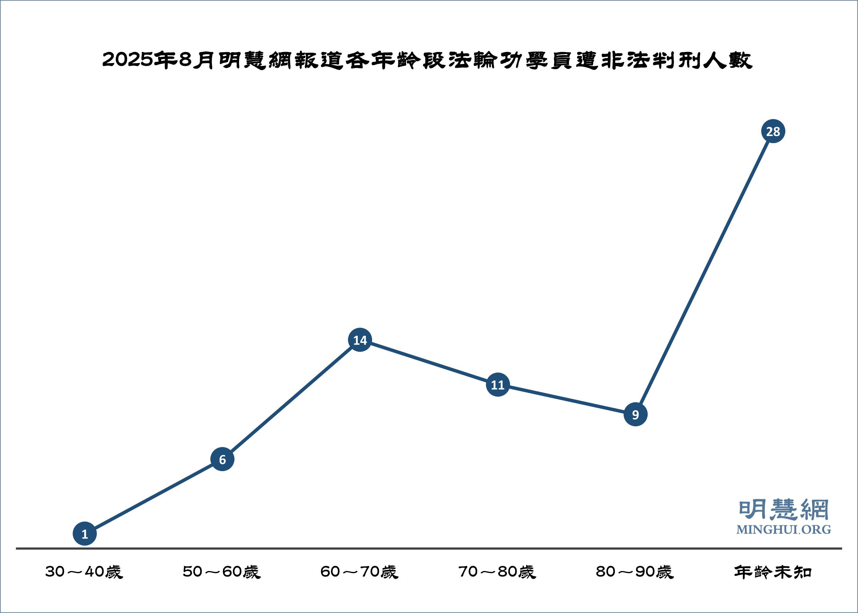 ![]() 图3:2025年8月明慧网报道各年龄段法轮功学员遭非法判刑人数 |