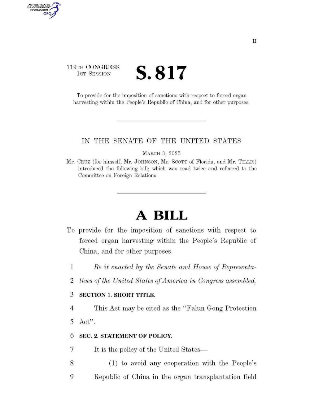 《法轮功保护法案》(S.817法案)由德克萨斯州共和党联邦参议员泰德·克鲁兹于今年三月三日提出,法案指出中共仍在参与活摘法轮功学员的器官暴行。该法案将对那些参与强摘器官的个人或共谋实施制裁,对中共追责。
