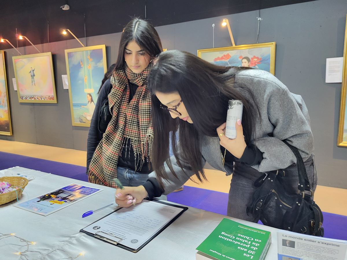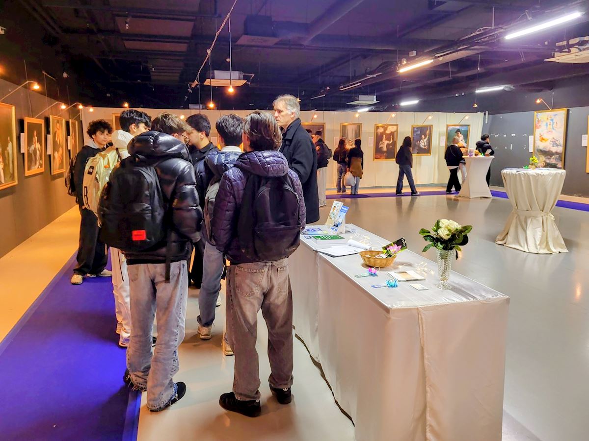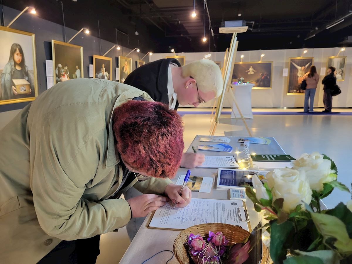 此次画展吸引了许多年轻人和学生,他们静静的聆听、观看和思考着画作带给他们的震撼。纷纷签名反迫害。