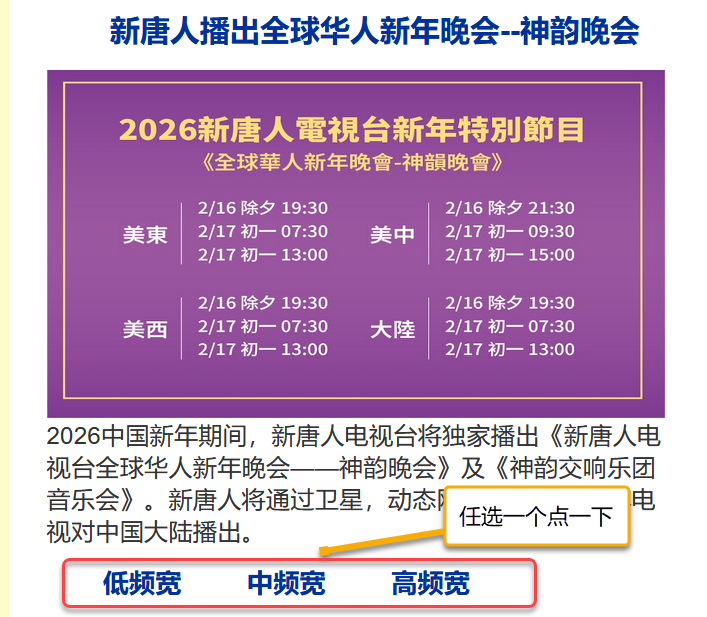 2026全球华人新年晚会(神韵晚会)在大陆的播出时间: