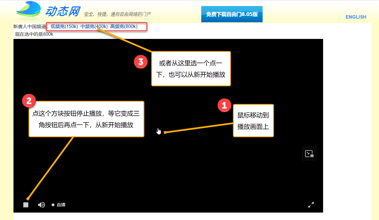 2、如果您使用动态网观看神韵晚会,可以试试自由门的不同通道,点自由门界面上的“设置”,在右侧可以选A通道、F通道或M通道,如果自由门找不到服务器,注意不要频繁重试,要过一段时间后(例如15分钟)再次尝试。请先打开动态网,点左侧的“低频宽”或“中频宽”、“高频宽”(根据自己的网络情况选择)。打开直播的方法如图: