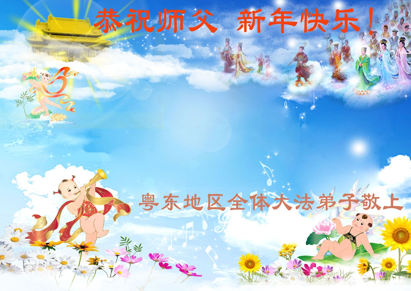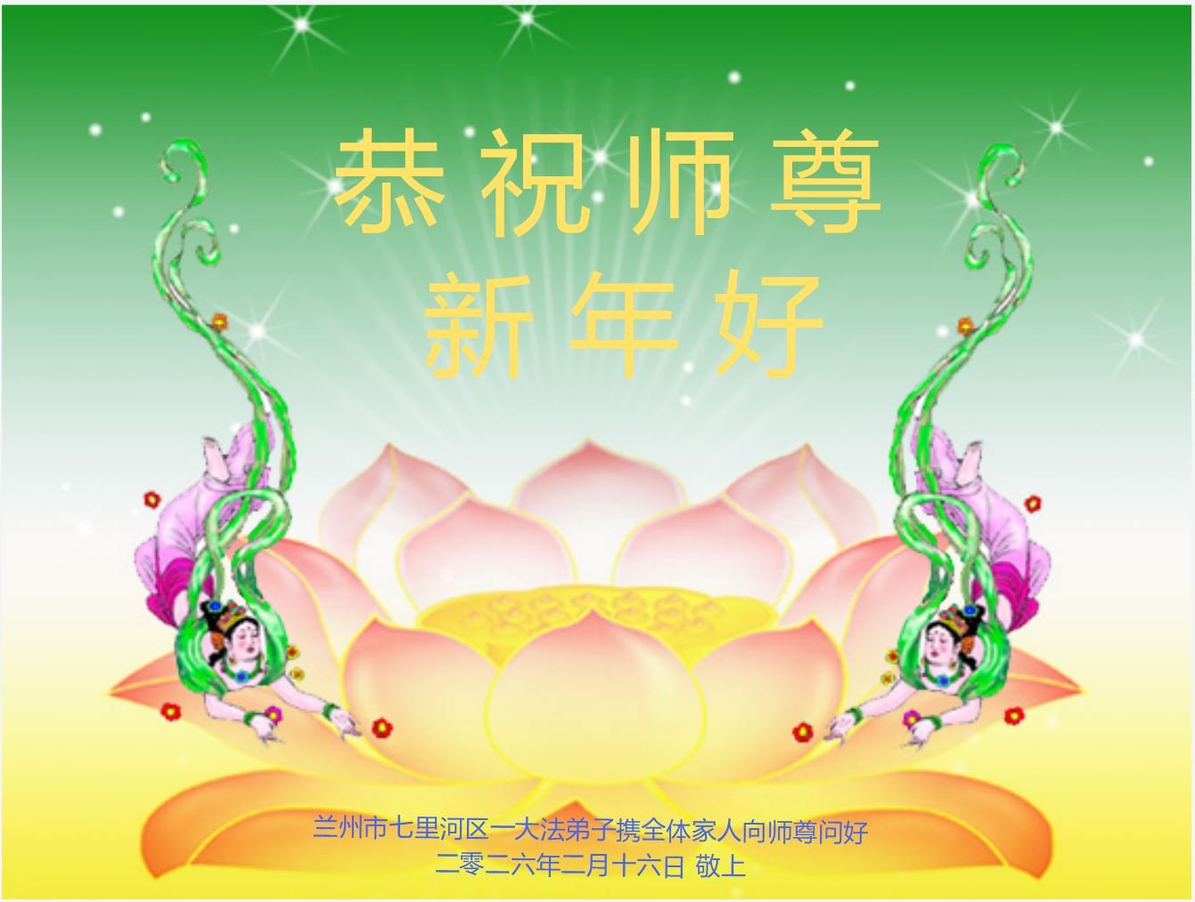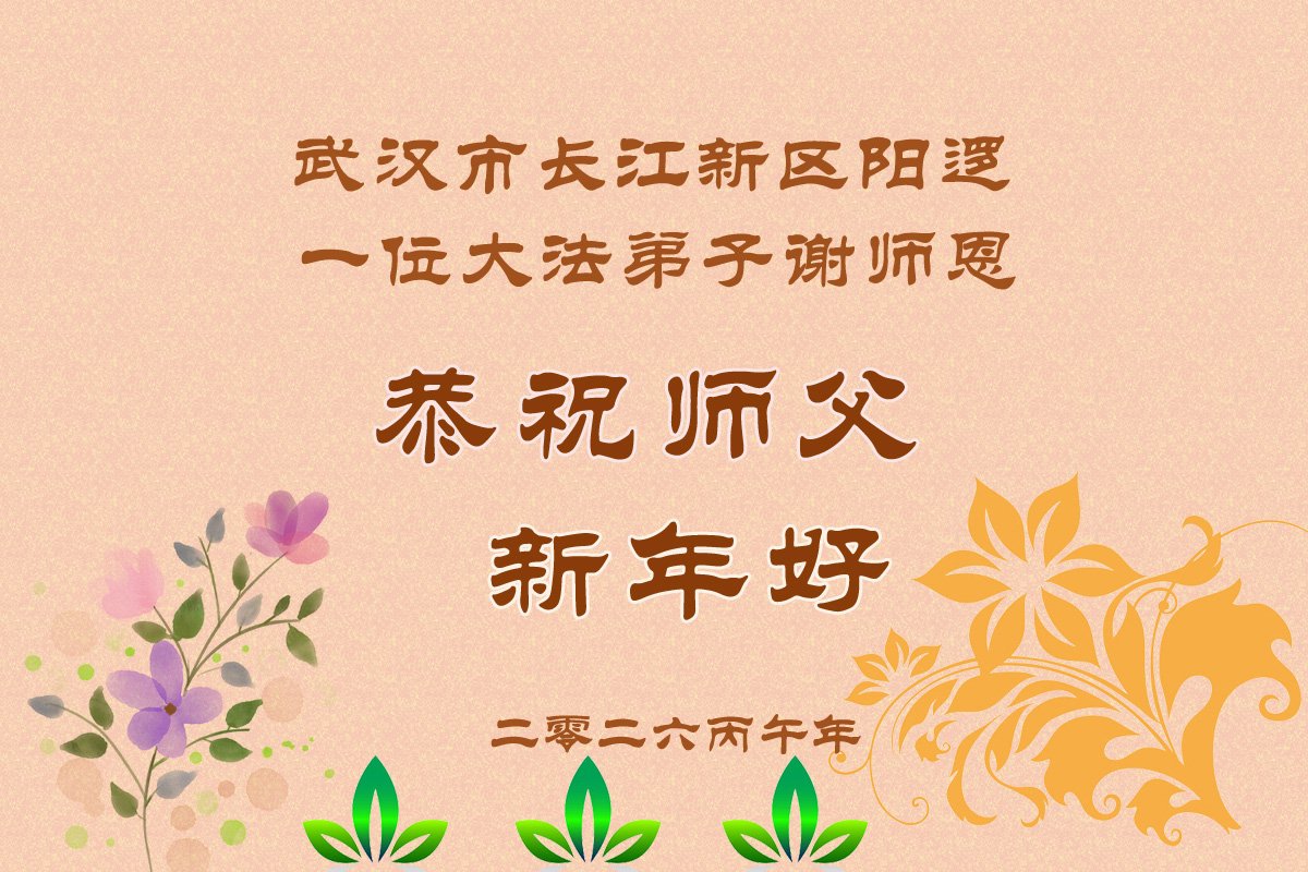 尊敬的师父,新年好!您辛苦了!多年来,您为弟子与众生付出承受的太多太多了,弟子无限感恩与珍惜!得救的众生无不欢欣鼓舞,感恩师父的慈悲救度!弟子会更加努力做好三件事,走好今后的路。愿师父多一份欣慰,少一份操劳。
