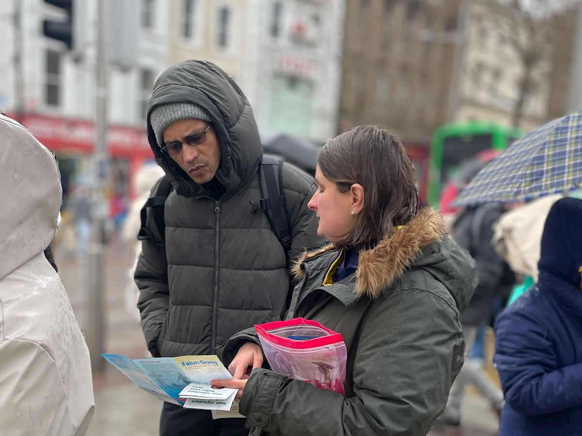 当日,尽管风雨不断,法轮功学员依然来到都柏林市中心讲真相。在丙午马年伊始,将大法的美好带给当地民众以及来自世界各地的游客,并传递新年祝福。