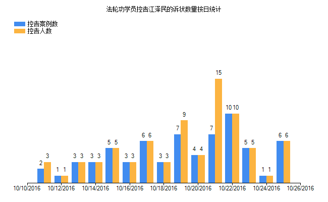 法轮功学员及家属递交给中国最高检察院、法院的实名诉讼状副本。2016年10月25日一天,超过6人(6案例)递交诉状控告江泽民。由于网络封锁和信息传输的不便,实际数字不止于此。